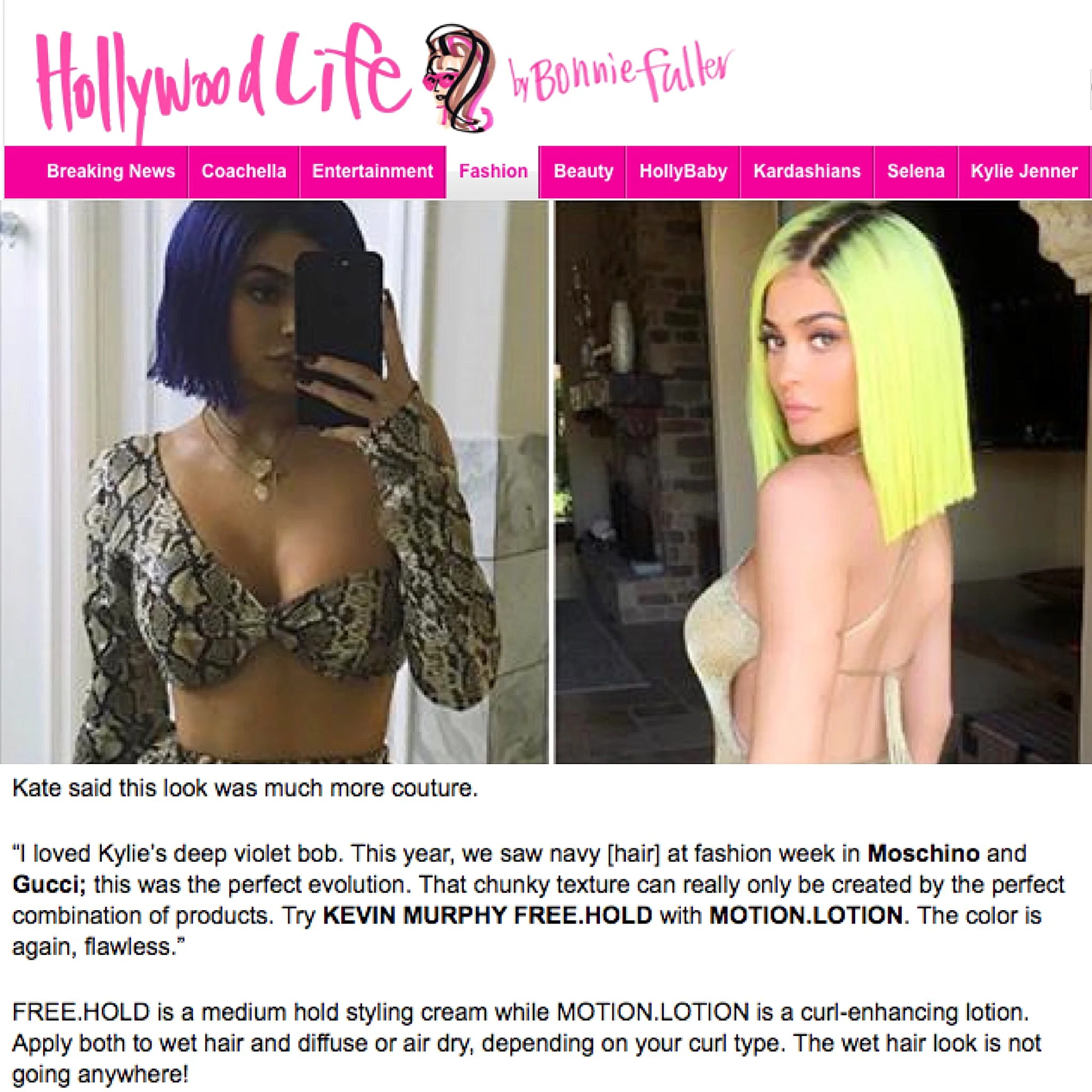 “I loved Kylie’s deep violet bob. This year, we saw navy [hair] at fashion week in Moschino and Gucci; this was the perfect evolution. That chunky texture can really only be created by the perfect combination of products. Try KEVIN MURPHY FREE.HOLD with MOTION.LOTION. The color is again, flawless.”